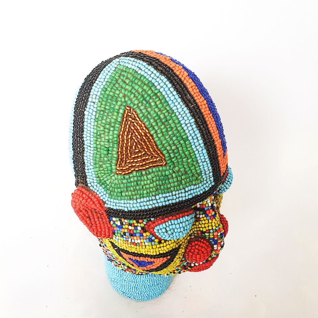 Sculpted in terracotta and fully beaded by hand, each head requires hours of meticulous, patient work. Every bead is placed using ancestral techniques, giving each piece its own rhythm, visual power, and uniqueness.