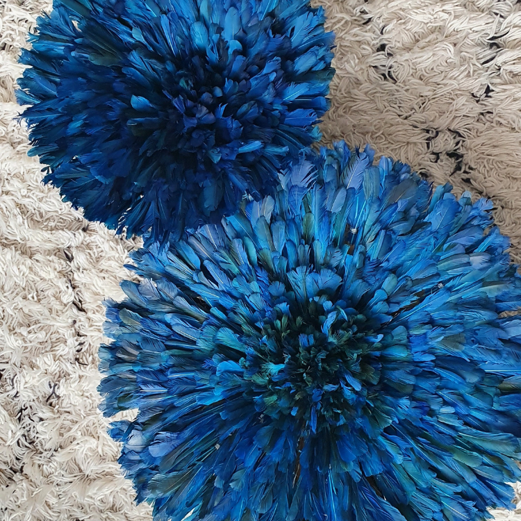 The Bamileke authentic juju hat blue, once a regal Cameroonian headdress, has gracefully transitioned into a chic and sought-after wall decoration. Artisans handcraft the authentic juju hat with savoir-faire using natural materials like feathers, rattan, and raffia. It infuses traditional heritage into contemporary interiors with an air of refinement.