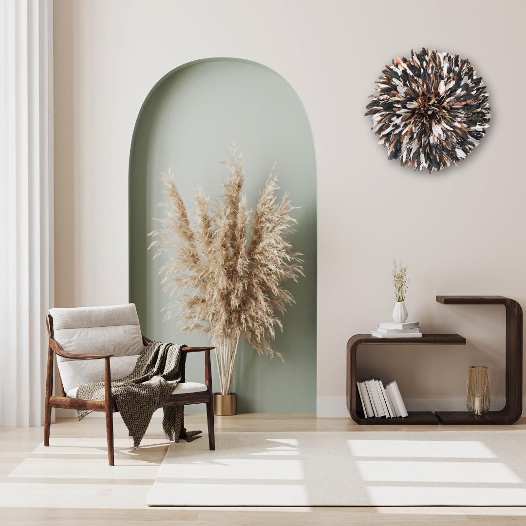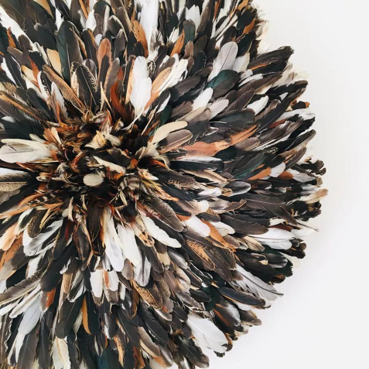 The Bamileke authentic juju hat mix white brown, once a regal Cameroonian headdress, has gracefully transitioned into a chic and sought-after wall decoration. Artisans handcraft the authentic juju hat with savoir-faire using natural materials like feathers, rattan, and raffia. It infuses traditional heritage into contemporary interiors with an air of refinement.