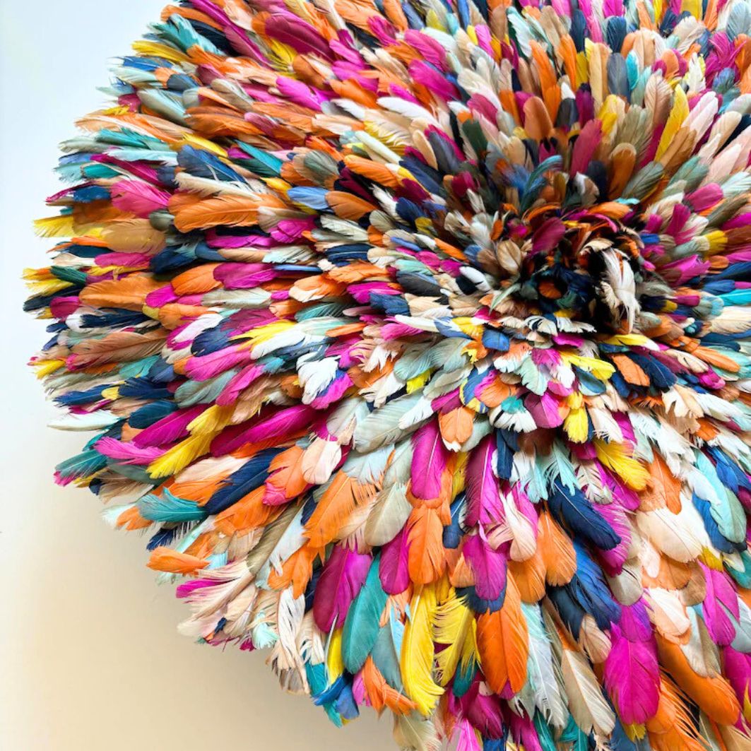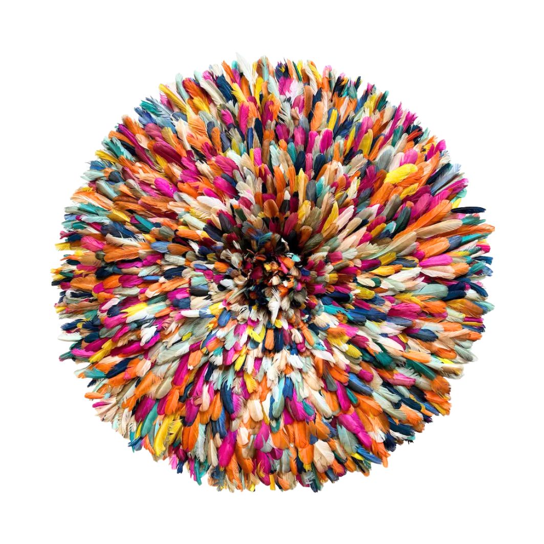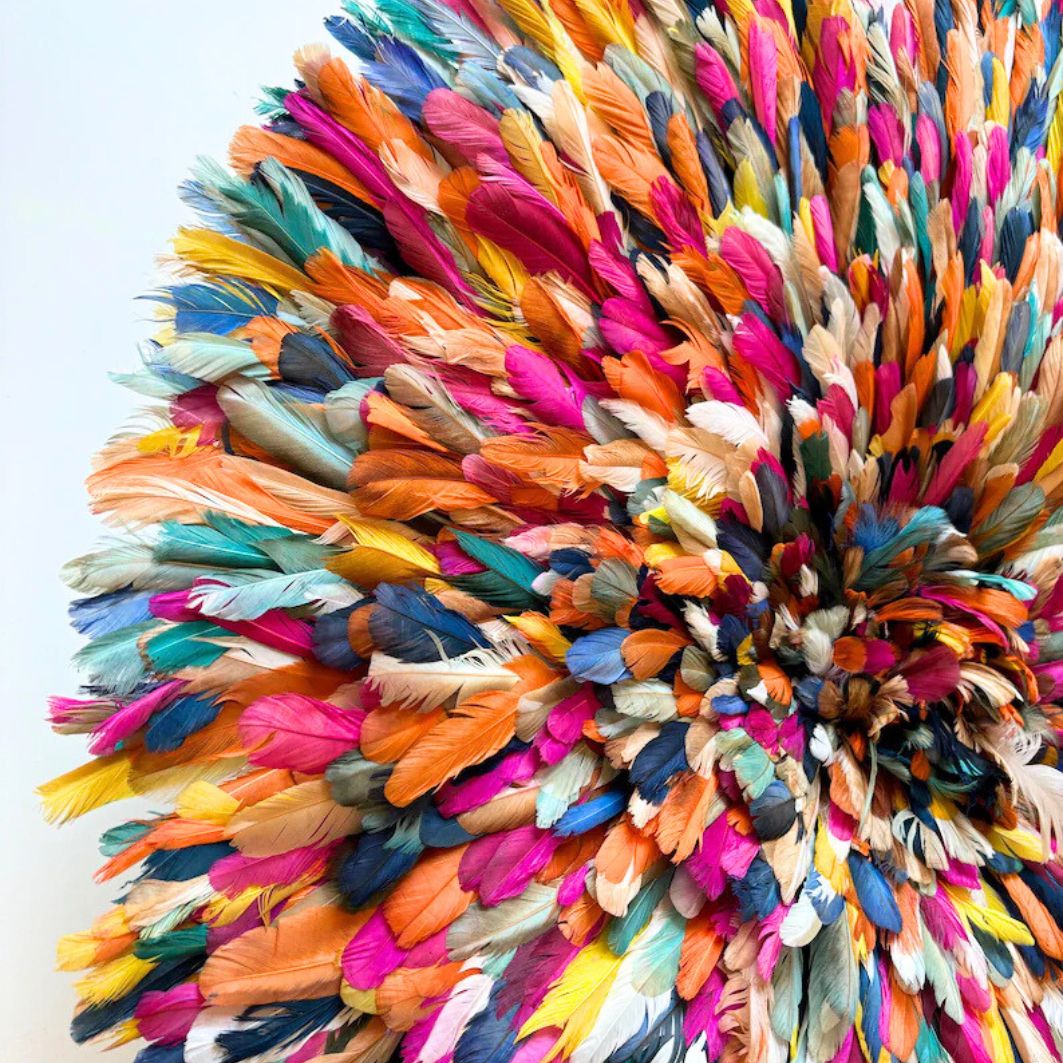 A burst of color and vitality, this multicolored model brings a festive and creative energy to any space. Each feather contributes to a striking, vibrant, and joyful visual effect. Perfect for energizing modern, boho, or artistic interiors, it’s a true statement piece that sparks positivity and draws attention. The authentic juju hat represents PROSPERITY and ABUNDANCE. It’s believed to bring positive energy, wealth, and success into any home or business.