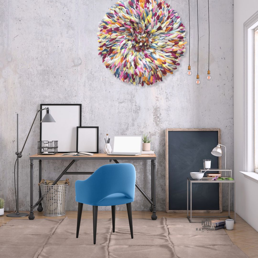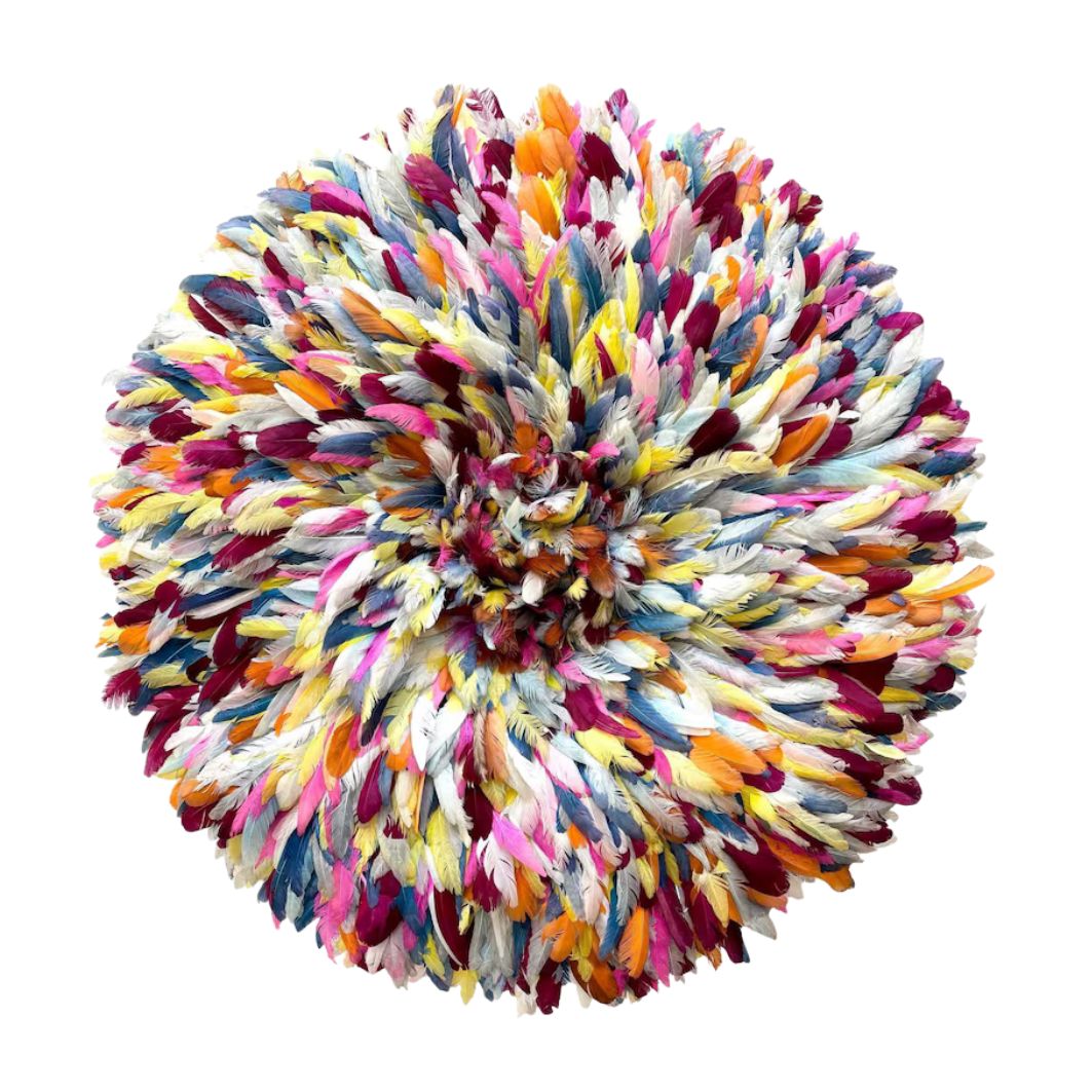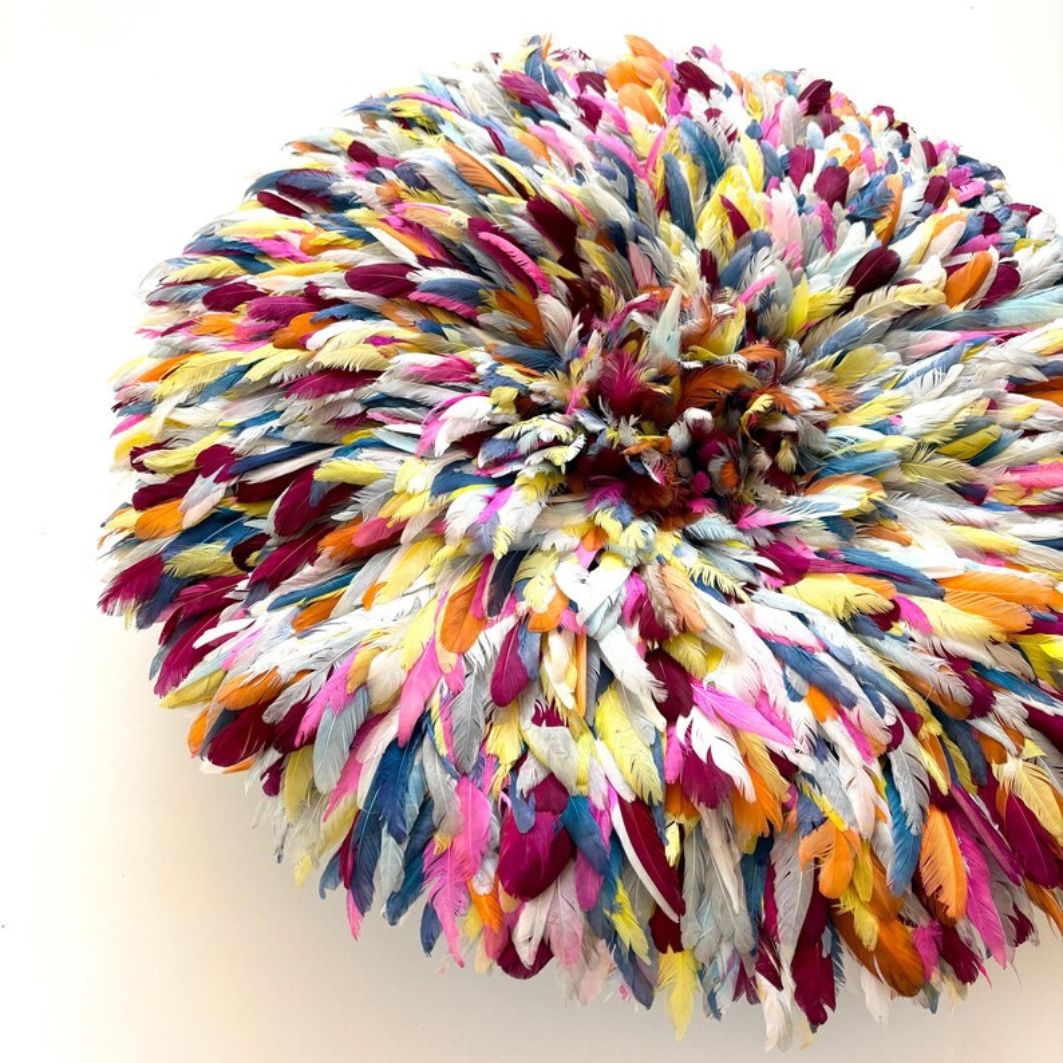 The Bamileke authentic juju hat multicolor pastel pink accent, once a regal Cameroonian headdress, has gracefully transitioned into a chic and sought-after wall decoration. Artisans handcraft the authentic juju hat with savoir-faire using natural materials like feathers, rattan, and raffia. It infuses traditional heritage into contemporary interiors with an air of refinement.