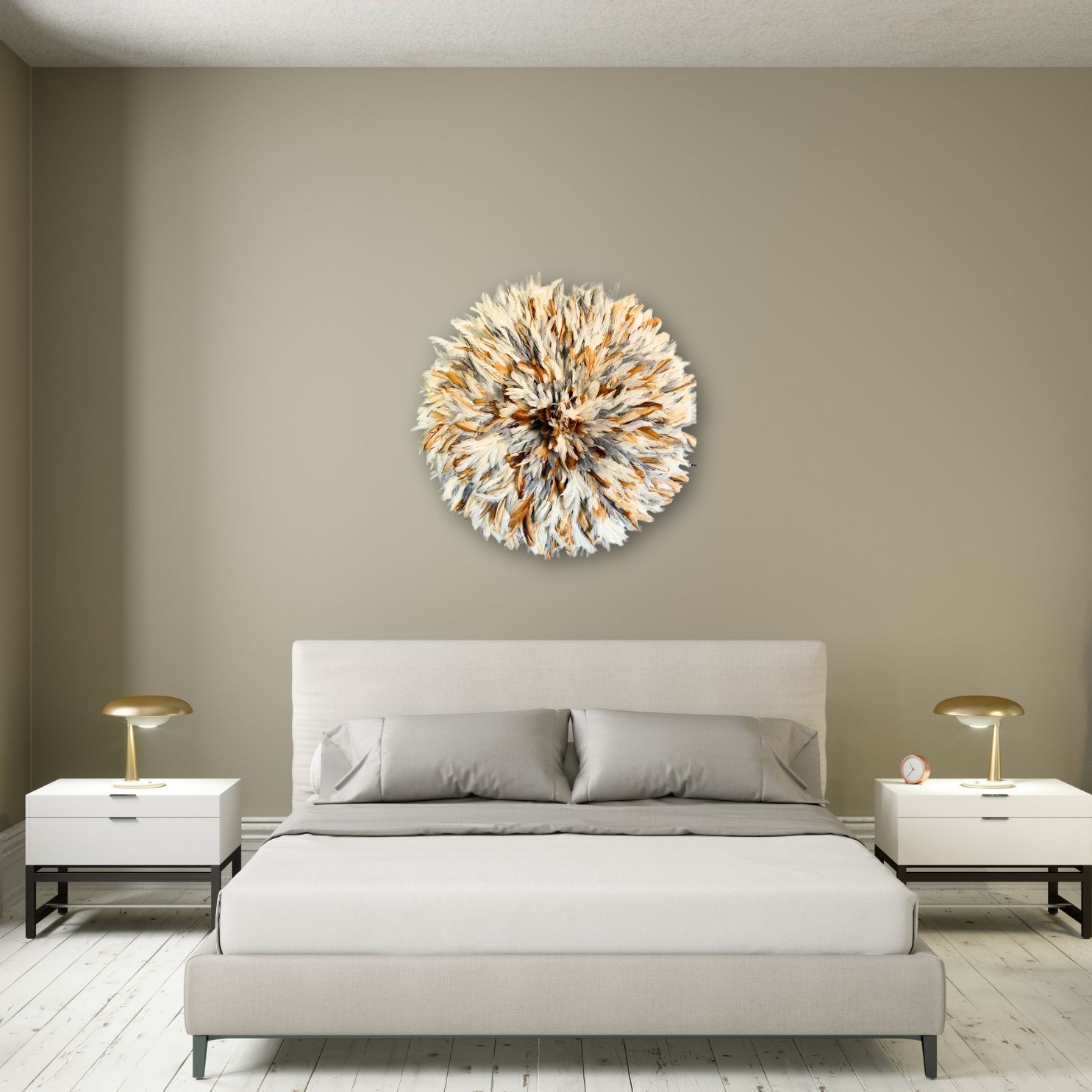 This juju hat blends white, soft grey and sandy beige feathers in a delicate harmony that evokes calm and serenity. Its natural gradient mirrors mineral textures and gentle light, making it ideal for wabi-sabi, Scandinavian, or nature-inspired interiors. A tribute to balance, understated elegance, and the raw beauty of earth tones. The authentic juju hat represents PROSPERITY and ABUNDANCE. It’s believed to bring positive energy, wealth, and success into any home or business.