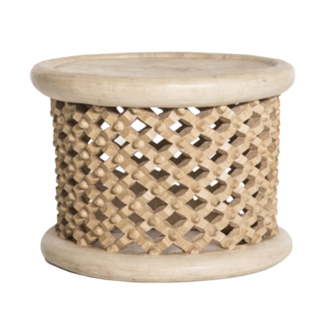The Beaded Bamileke Stool Spider is a sculptural celebration of balance and light. Carved from a single block of wood, it reveals a delicate spider motif, a symbol of connection, patience, and creative intelligence. Its warm hue and openwork structure invite both gaze and touch, awakening the brain’s instinctive response to natural textures and symmetry. More decorative than functional, it brings serenity and organic sophistication to any interior, an artful dialogue between craftsmanship, geometry, and silence. Details : Material: wood Finish: spider pattern Color: light brown Origin: handcrafted in Cameroon Use: decorative pedestal, side table, accent piece, stool, accent table Maintenance: dust gently with a soft, dry cloth