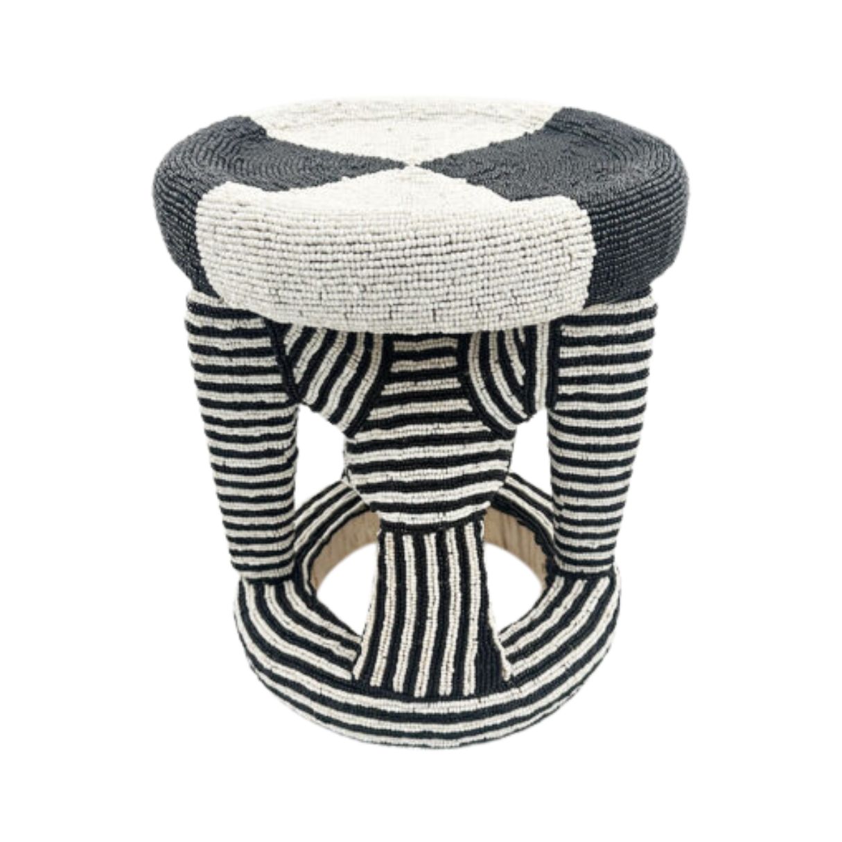 The beaded Bamileke stool is not merely furniture, it is an object of contemplation. Entirely hand-beaded by artisans in Cameroon, it embodies the rhythm of patience and the grace of precision. Its tactile surface and hypnotic geometry awaken a subtle fascination, engaging the senses before the mind. Placed as a side table, pedestal, or art piece, it transforms space into a moment of stillness, where beauty, texture, and light meet in perfect harmony. A silent statement of refinement. Details : Material: wood, glass beads, cotton thread Finish: hand-beaded surface (patterns vary) Colors: black, white, red Origin: handcrafted in Cameroon Use: decorative pedestal, side table, accent piece, stool, accent table Maintenance: dust gently with a soft, dry cloth
