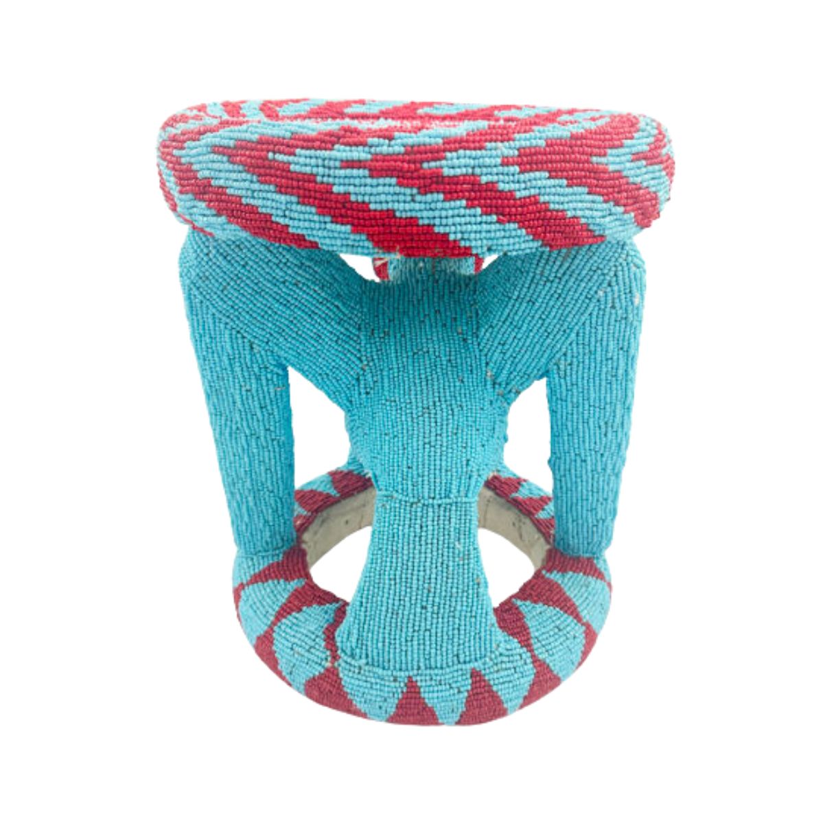 The beaded Bamileke stool is not merely furniture, it is an object of contemplation. Entirely hand-beaded by artisans in Cameroon, it embodies the rhythm of patience and the grace of precision. Its tactile surface and hypnotic geometry awaken a subtle fascination, engaging the senses before the mind. Placed as a side table, pedestal, or art piece, it transforms space into a moment of stillness, where beauty, texture, and light meet in perfect harmony. A silent statement of refinement. Details : Material: wood, glass beads, cotton thread Finish: hand-beaded surface (patterns vary) Colors: turquoise, red Origin: handcrafted in Cameroon Use: decorative pedestal, side table, accent piece, stool, accent table Maintenance: dust gently with a soft, dry cloth